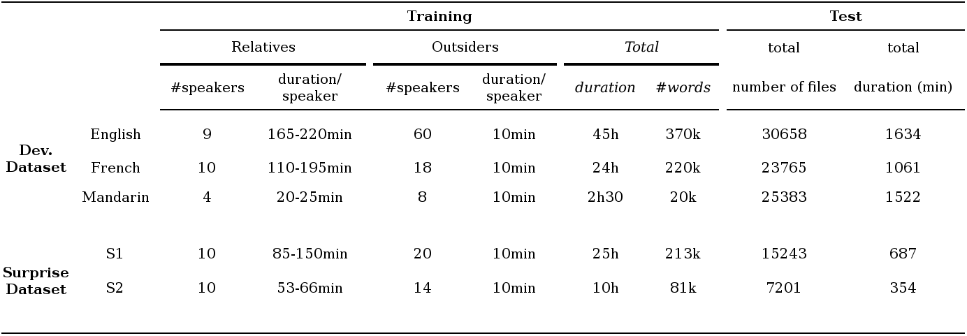 - Speaker adaptation/invariance: In the previous challenge, most teams made little use of the speaker information provided. The possible reason was that there were not really enough data per speaker to enable the construction of speaker specific models or to use speaker adaptation techniques. Yet, in [15], it was shown that terms discovered in the baseline of Track 2 could be used to construct speaker invariant features, even though most of the terms were actually within speaker. Here, we will provide datasets and metrics geared towards using speaker adaptation techniques. Each language will be itself split in a train set and a test set at the level of speakers. The train set will be used for training the system’s parameters. It will incorporate a distribution of speakers that are intended to mimic those available in naturalistic autonomous situations (mimicking a power law, with few speakers speaking a lot–relatives, and a lot of speakers speaking little–outsiders) with explicit ID tags. In the test set, no training will take place, only decoding. The test set contains only new speakers in unknown number appearing in many small files of average size ranging from 1s to 2 min. The names of the files will be scrambled, and no ID tag will be provided. The only speaker information available is that each file contains only one speaker, enabling to measure the effect of speaker adaptation as a function of file size.