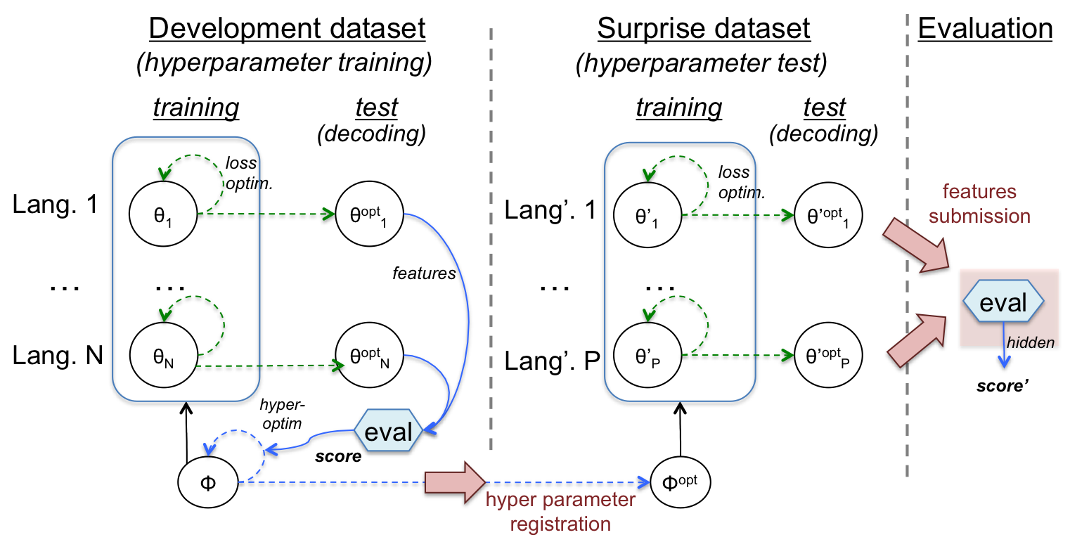- Generalization across Languages: What the challenge is after, is systems that can discover linguistic representations in any language. The participant’s task is to construct their system and tune their hyper-parameters so as to be robust across languages. The 2017 challenge therefore uses a classical training/test split, but at a higher level than usual: at the level of language corpora, not at the level of utterances. Specifically, it provides a development dataset (hyperparameter training set) made of three language corpora together with full train/test split, evaluation software and phone annotations, so that participants can fully train their systems, test them and tune their hyperparameters. Participants are encouraged to use cross validation so as to avoid overfitting on the three development languages. At this point, participants will register their hyperparameters and code. Once done, they will receive the surprise dataset (hyperparameter test set): two new languages in bare form (raw signals, no labels, no evaluation software) on which they can only run their code with the fixed set of registered hyperparameters. The results will be submitted to a website which will run and return the results of the evaluations. Each team will only be able to submit once (see Figure 1).