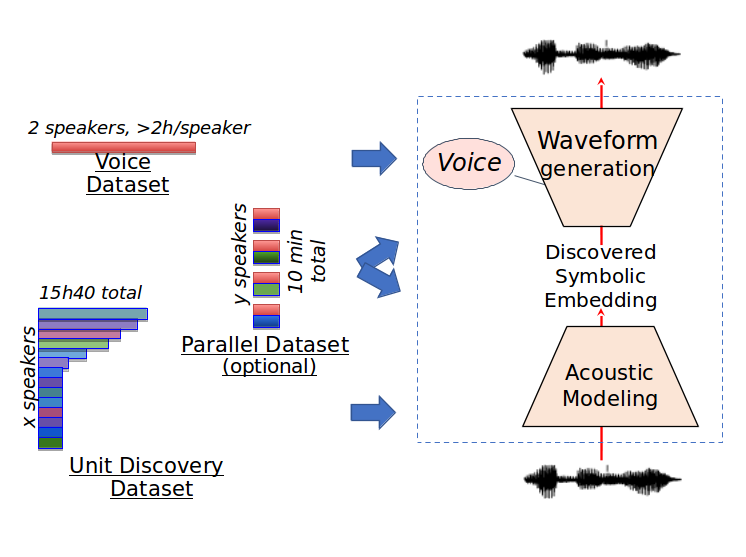 Figure 1b. Summary of the datasets used in the ZeroSpeech2019 Challenge. The Unit Discovery dataset provides a variety of speakers and is used for unsupervised acoustic modeling (i.e., to discover speaker-invariant, language-specific subword discrete units–symbolic embeddings). The Voice dataset is used to train the synthesizer. The Parallel dataset is for fine tuning the two subsystems. These datasets consist in raw waveforms (no text, no label beyond speaker ID).