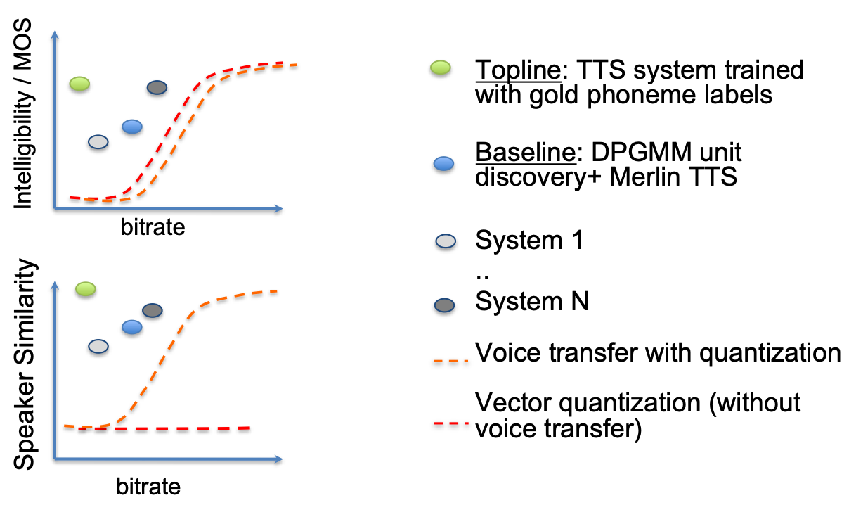 As with the other ZR challenges, the primary aim is to explore interesting new ideas and algorithms, not to simply push numbers at all costs. Our leaderboard will therefore reflect this fact, as TTS without T is first and foremost a problem of tradeoff between the bit rate of the acoustic units and the quality of the synthesis. At one extreme, a voice conversion algorithm would obtain excellent synthesis, but at a cost of a very high bit rate. At the other extreme, a heavily quantized intermediate representation could provide a very low bit rate, at a cost of a poor signal reconstruction. Therefore the systems will be put on a 2D graphs, with bit rate on the x axis, and synthesis quality on the y axis (see Figure 2).
